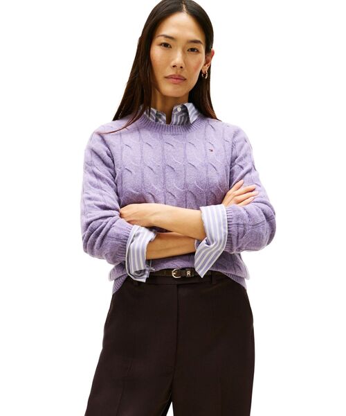 ソフトウールケーブルクルーネックセーター立体的で表情豊かなケーブル編みのクルーネックセーター。左胸にフラッグ刺繍、首裏側にグローバルストライプを配したシンプルなアイテムです。すっきりとしたレギュラーシルエットで、一枚着はもちろん、ジャケットのインナーとしても活躍します。毛100%素材ならではの暖かな着心地も魅力です。【サイズ】XXS:着丈54cm 身幅44cm 肩幅32cm 袖丈59cmXS:着丈56cm 身幅45cm 肩幅32cm 袖丈60cmS:着丈59cm 身幅48cm 肩幅36cm 袖丈61cmM:着丈60cm 身幅49cm 肩幅37cm 袖丈61cm【TOMMY HILFIGER】永遠のアメリカンクラシックをベースにモダンなひねりを加えたデザインが人気のトミーヒルフィガー。都会的で洗練されたメンズ・ウィメンズに加え、チルドレン、ゴルフライン、そしてよりカジュアルなデニムラインと豊富なカテゴリーが揃うグローバルブランド。