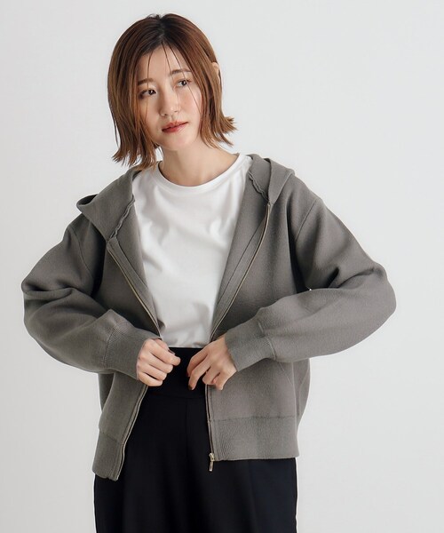 上品なニットだから欲しい フードジップパーカー 【デザイン】 一見カジュアル属性のフードジップパーカーをニットに置き換えた、フェミニンさんも取り入れやすいキレイめスタイルに合うフードパーカーです。 滑らかな肌触りともっちりしたジャカード編みでお作りしているので、適度な肉感があります。 普段の装いにさっと羽織っていただける手軽さと上品さを併せ持ち、カジュアルからキレイめの両方のスタイルに合います。 袖口はリブでメリハリを付けたパフデザインでよりフェミニンな雰囲気に仕上げています。 ※ポケット数:前×2 【素材】 柔らかい風合いと滑らかな肌触りが特徴のレーヨン混の糸を使用。 ジャカード編みで身体のラインを拾いにくいしっかりした肉感があるのが特徴です。 【スタイリング】 普段のコーディネートのパンツやスカート、ワンピースの上にさっと気軽に羽織っていただけます。 真冬の時期のコートインとしてもお洒落なレイヤードスタイルがお楽しみいただけます。 ※照明の関係により、実際よりも色味が違って見える場合があります。また、パソコン・スマートフォンなどの環境により、若干製品と画像のカラーが異なる場合もございます。 【24AW】 モデル情報:身長166cm B80 W59 H86 着用サイズ:02(M) 店舗へのお問い合わせ商品番号:768-39055 ●製品寸法: 01(S):着丈53cm B96cm 袖丈49cm 肩幅46cm 02(M):着丈55cm B100cm 袖丈50cm 肩幅48cm 03(L):着丈57cm B104cm 袖丈50cm 肩幅50cm 04(LL):着丈59cm B108cm 袖丈51cm 肩幅52cm 05(3L):着丈61cm B112cm 袖丈51cm 肩幅54cm 備考: