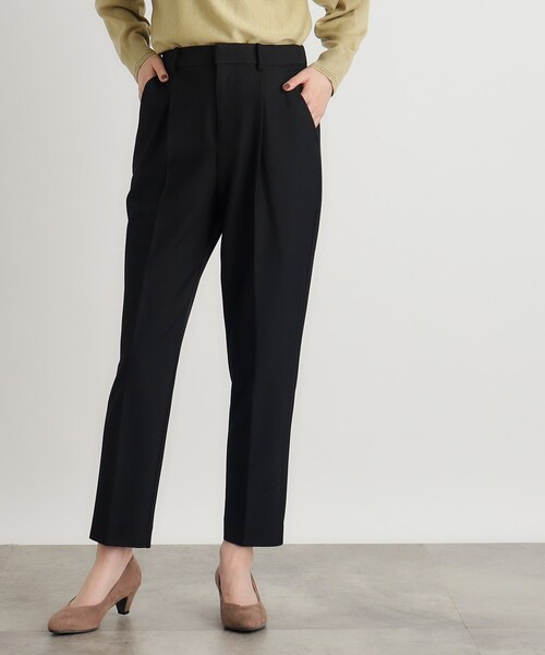 タテヨコ伸びる、2WAYストレッチ素材で穿き心地◎【デザイン】センタープレス入りのきれいめテーパードパンツ。足首が程よく見える9分丈ですっきりとした見栄えでありながら、ワンタック仕様でお尻からもも周りにややゆとり感があり着心地◎。後ろウエストの脇にゴムを入れて、お腹周りの圧迫感を軽減させてています。中心部分にはあえてゴムを入れずにギャザーを寄せていない為、ポケット周りがすっきりと見え、後ろ姿も美しいデザインです。裾口が広がらないので、パンプス、フラットシューズやスニーカーでも合わせる靴を選ばないのも嬉しいポイントです。※ポケット数:横×2 後ろ×2【素材】タテ、ヨコ伸びる2WAYストレッチ素材を使用しています。ウールライクな杢感が特徴です。微起毛加工で、シーズンレスで着用できる素材感です。※裏地なし【スタイリング】シンプルなデザインなので、きれいめにもカジュアルにもシーンを選ばずスタイリングが楽しめます。※照明の関係により、実際よりも色味が違って見える場合があります。また、パソコン・スマートフォンなどの環境により、若干製品と画像のカラーが異なる場合もございます。【24AW】モデル情報:身長166cm B80 W59 H86 着用サイズ:02(M)店舗へのお問い合わせ商品番号:768-69055●製品寸法:01(S):W65~73cm H99cm 股下64cm 前股上29cm 渡り幅32cm 裾幅16cm02(M):W68~76cm H102cm 股下65cm 前股上30cm 渡り幅33cm 裾幅17cm03(L):W71~79cm H105cm 股下66cm 前股上30cm 渡り幅34cm 裾幅17cm04(LL):W74~82cm H108cm 股下67cm 前股上30cm 渡り幅35cm 裾幅18cm05(3L):W77~85cm H111cm 股下67cm 前股上31cm 渡り幅36cm 裾幅18cm備考: