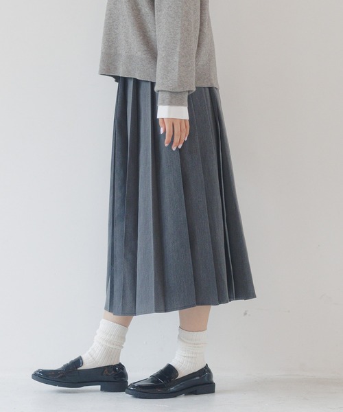 プリーツデザインがポイントのミディスカート。裾に向かって広がるシルエットで、ミディ丈が大人っぽい印象に。ウエストがゴム仕様なので着脱のしやすさも〇【素材】滑らかなポリエステル混の素材感。【スタイリング】合わせるトップスを選ばずスタイリングできるアイテムです。スタイリングに取り入れればプレッピースタイルを楽しめます。