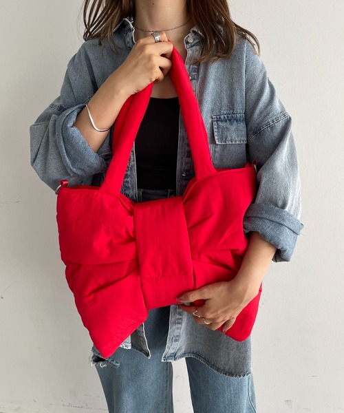 【リボンの形が目を惹くナイロン素材のショルダーバッグ】リボンの形が可愛いバッグ。開閉はマッジックテープでストレスフリー。綾素材の同色ショルダーベルトも入っているので、2WAYでご使用頂けます。しっかり大容量で、物の出し入れがしやすいのが嬉しいポイント◎普段使いにちょうど良いサイズ感です。お洋服に馴染みの良いくたっとした生地感と軽量素材でストレスフリーに使用可能。A4サイズが収納可能なところも、嬉しいポイント。PC(13インチ)やファイルを入れて通勤用としてもお使いいただけます。[仕様]開閉:マジックテープ、ファスナー内側:ファスナーポケット×1同色ショルダーベルト×1【インフォメーション】▼商品のお気に入り登録完売カラーの再入荷通知を受け取ることができます。ぜひご登録ください★▼ブランドのお気に入り登録新商品や再入荷などのお得情報を受け取ることができます。ぜひご登録ください♪