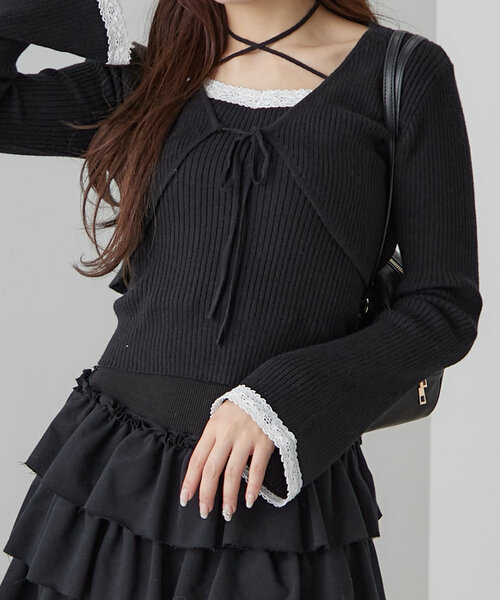 大人気のアンサンブルが 秋冬バージョンのニット素材で登場! ■デザイン ・レースがポイントのボレロとキャミインナーがセットになったアイテム。 ・これ一つでレイヤードスタイルが完成し、今っぽいスタイリングに。 ・ボレロは袖が広がるベルスリーブで、腕のラインをきれいに見せてくれて女性らしさを演出します。 ・インナーは伸縮性のあるリブ素材で着心地よく、ホルターネックデザインなので後ろ姿もかわいく着れます。 ・ボレロとインナーは、別々でも着まわし可能です。 ■カラー ・オフ/ピンク/モカ/ブラックの4色展開 ■スタイリング ・ガーリー好きな方はミニスカートを合わせるのがおすすめです。 ・スウェットパンツやカーゴパンツを合わせると韓国っぽカジュアルガーリーな今っぽい着こなしに。 ・お手持ちのカップ付きインナーの上からボレロを重ねても◎ ----------------------------- 裏地:なし 光沢感:なし 透け感:なし 伸縮性:あり 手洗い:可能 タンブラー乾燥:不可 アイロン:110℃まで ----------------------------- 取り扱い上の注意 ※キャンペーンやフェアにより価格が変動する場合がございます。 ※サンプルで撮影している為、実際の商品と若干仕様が異なる場合がございます。 ※インナーはカップ付ではございません。予めご了承ください。 ※着用、お取り扱いの際は、商品についている品質表示とアテンションタグを必ずご確認下さい。 ※ご覧のモニター環境や撮影環境により実際の商品と多少色味が異なって見える場合がございます。 ご理解の程よろしくお願いいたします。 ≪返品・交換について≫ ・着用後、洗濯後の返品・交換は致しかねます。 ・商品到着後、着用前に商品状態のご確認をお願い致します。
