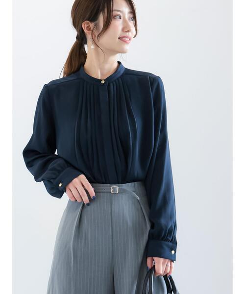 フロントに寄せられたタックが表情感を演出するブラウス。 シンプルなバンドカラーになっており、首元にすっきりとした印象を与えます。 さりげないアクセントになる金釦がポイント◎ デイリーユースはもちろん、オフィスカジュアルにもお使いいただけるアイテムです。 ※商品画像は、撮影環境やお客様のご利用のPC・スマートフォンのモニター環境などにより実物と色味に差異がある場合がございます。