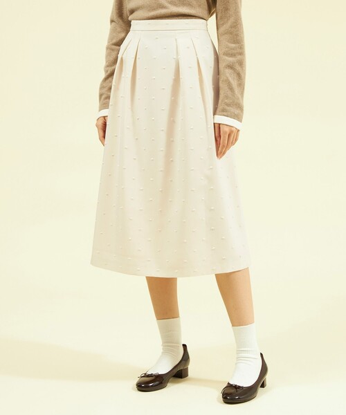 <ふんわりタックが華やかなミディ丈スカート> 立体的なカットジャガードが上品で高級感のある雰囲気に。 ハリのある素材でクラシカルなフレアシルエットが美しく、ほどよいボリューム感が可憐な印象を与えてくれます。 【素材】 カットジャガードの手法で立体的に表現した上品で高級感のある素材です。シンプルなドット柄で華美にならず、繊細さが特徴。 おすすめ着用期間:春/夏/秋/冬 ※34サイズはオンラインストア、ジェイアール名古屋タカシマヤ店、阪急うめだ本店、山形屋店のみでのお取扱いになります。 ※サイズについては、仕様書のサイズを記載しており、多少の誤差が出る場合がございます。 ※この商品はサンプルでの撮影を行っています。 実際の商品とイメージ、仕様が異なる場合がございます。
