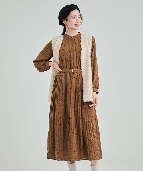 【デザイン】1枚でコーデが決まる プリントワンピースです。スカート部分にプリーツ加工がかかっており、ボリュームがありながらもすっきり見えします。ウエスト部分にはゴムが入っており、簡単にブラウジングができます。※ポケットなし【スタイリング】1枚着としてはもちろん、ジャケットを合わせたきれいめスタイルもおすすめです。ジレやカーディガン、Gジャンを合わせてカジュアルな着こなしにもマッチします。【お客様からいただいたコメント】・秋らしく大人かわいいワンピースです。 (身長:148cm 体型:普通 キャメルブラウンのMサイズ購入)・仕事にも着ていけそうだと思い購入。色もいいしおしゃれです。 ベストを重ねて着ましたが、プリーツスカート部分もいい感じです。 (身長:154cm 体型:普通 ネイビーのMサイズ購入) とのお声を頂戴しております。【素材】さらりとしたやわらかな素材。少し透け感がございます。スカート部分のみ裏地を付けています。※この商品は、プリーツ加工を施してありますが、永久的なものではありません。※照明の関係により、実際よりも色味が違って見える場合があります。また、パソコン・スマートフォンなどの環境により、若干製品と画像のカラーが異なる場合もございます。モデル情報:身長163cm B81 W59 H88 着用サイズ:02(M)店舗へのお問い合わせ商品番号:741-59021●製品寸法:01(S):着丈114cm B82cm 袖丈54cm 肩幅35cm W52~68cm H81cm 付属ベルト全長108cm 幅2.5cm 対応サイズフリー02(M):着丈115cm B84cm 袖丈54cm 肩幅35cm W53~69cm H84cm 付属ベルト全長112cm 幅2.5cm 対応サイズフリー03(L):着丈116cm B86cm 袖丈55cm 肩幅36cm W54~70cm H87cm 付属ベルト全長116cm 幅2.5cm 対応サイズフリー04(LL):着丈117cm B88cm 袖丈56cm 肩幅36cm W56~72cm H90cm 付属ベルト全長120cm 幅2.5cm 対応サイズフリー備考: