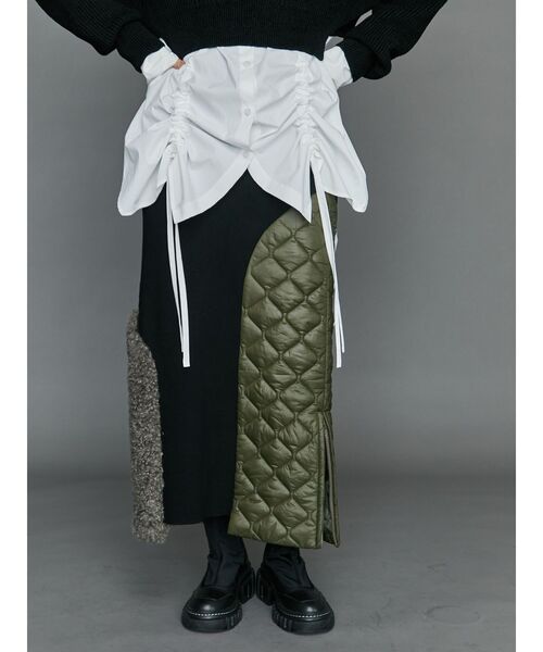 シープファーのようなボリュームカールが特徴的なフェイクファーとキルティング素材をドッキングしたハイブリットなニットスカート。ベースは編地の詰まったニット素材なので着心地良くラフに着て頂けます。1枚でインパクトのあるデザインです◎同デザインでトップスも展開しているのでセットアップでの着用もオススメです。 この商品は【522462602101 FABRIC MIX KNIT TOP】とセットアップで着用いただけます。 ----------------- 透け感:なし 生地の厚さ:普通 裏地:なし 伸縮性:あり -----------------
