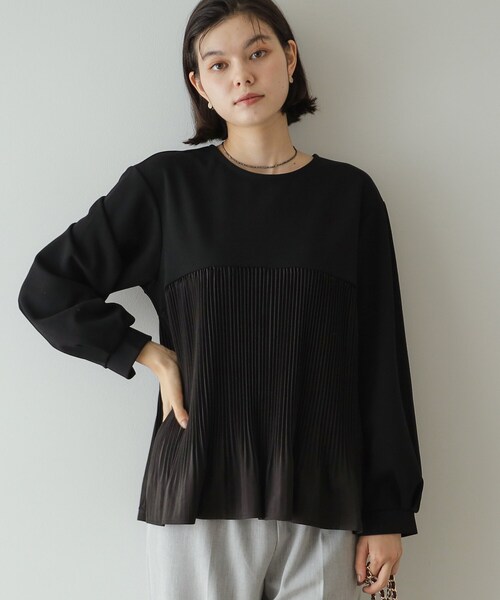 一枚で着映える、プリーツ切り替えのデザイントップス 【デザイン】 ・ブラウスのように着られる、着心地の良いジャージトップスとブラウス素材がドッキングされたデザイントップス。 ・胸下から切り替えられた繊細なプリーツデザインがポイント ・細かいプリーツが印象的なマジョリカプリーツデザインで華やかさのある一枚 ・ふんわりとしたシルエットで、気になるお腹まわりもカバー可能です 【素材】 ・ボディには、ブラウスのようなきれいめな見た目が叶う合繊素材のジャージを使用。 ・胸下からは、ポリエステル素材の軽やかなブラウス生地を使用。 ・マシンウォッシャブル ※この商品は、プリーツ加工を施してありますが、永久的なものではありません。 ※照明の関係により、実際よりも色味が違って見える場合があります。また、パソコン・スマートフォンなどの環境により、若干製品と画像のカラーが異なる場合もございます。 モデル情報:身長165cm B72 W57 H84 着用サイズ:38(M) 店舗へのお問い合わせ商品番号:637-19239 ●製品寸法: 38(M):着丈64cm B104cm 袖丈54cm 肩幅42cm 40(L):着丈65cm B106cm 袖丈54cm 肩幅43cm 42(LL):着丈66cm B108cm 袖丈54cm 肩幅44cm 備考: