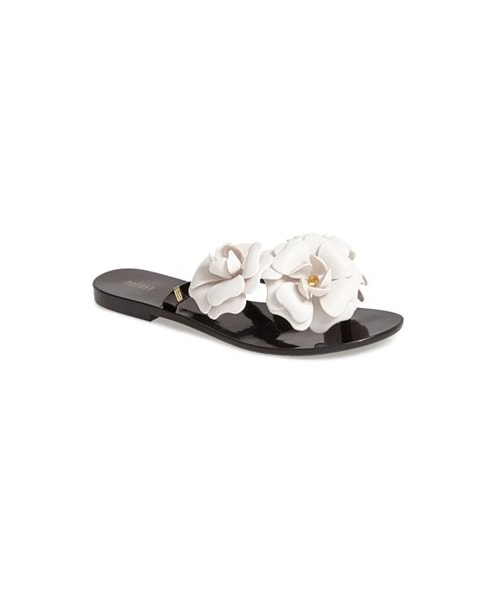 A beautiful bouquet of flowers tops the thong strap of a flexible, eco-friendly flat that's made from fruit-scented PVC. Neon colors are brighter in person. PVC upper, lining and sole. By Melissa; made in Brazil. Women's Shoes.