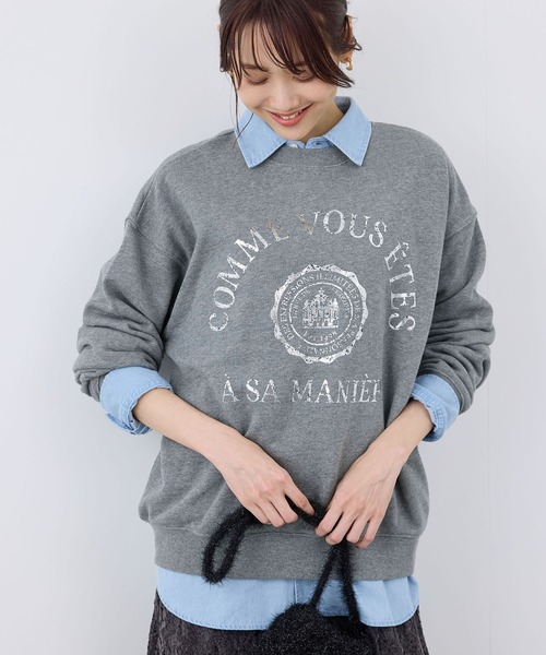プリントデザインが特徴的なカレッジロゴスウェット。【素材感】 ・ほど良い厚みの裏毛スウェット。 【デザイン・シルエット】 ・カレッジロゴの箔プリントは、掠れがかった加工によりヴィンテージテイストの仕上がり。 ・ドロップショルダーとリラックスフォルムでモダンなエッセンスもプラス。 【カラー】 ・ライトグレー(08):杢グレー×シルバープリント ・グレー系(09):オートミール×ゴールドプリント ・ネイビー(40):ネイビー×シルバープリント 【スタイリングポイント】 ・ダメージジーンズを合わせてアメカジルックに。 ・インにチェック柄シャツを重ねてもOK。 ・プリーツスカート、キルトスカートでトラッドにアレンジも可能。 ----------------------------- 裏地:なし 透け感:なし 伸縮性:ややあり 生地感・厚さ:普通 季節:春・秋・冬 ----------------------------- ※撮影時の光、お使いのモニター環境によって色の見え方が違う場合がございます。 ※モデル身長:165cm 着用サイズ:38
