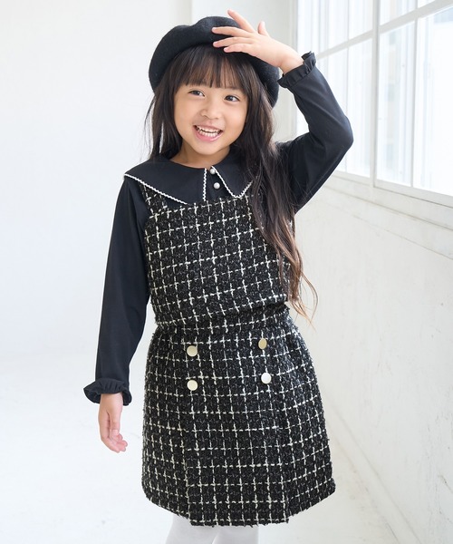 【素材感】・チェック柄のツイード生地を用いたキュートなキッズビスチェ。【デザイン・シルエット】・後ろ中心をギャザー使いにして、フィット感をアップ。・レイヤードに便利なクロップド丈。【カラー】・ブラック、アイボリーのモノクロカラー2色展開。【スタイリングポイント】・同シリーズのスカート(品番:GRC64030)に合わせて、ワンピース風に取り入れても。・大人のスカート(品番:GDC54130)、ジレ(品番: GDV54130)も展開しているので、親子お揃いもおすすめ。・カットソーやタートルニットなどに重ねて、普段使いに。・お出かけ用なら、レースブラウスに重ねて。<対応サイズ>Sサイズ:95?115cmMサイズ:115?135cmLサイズ:135?155cm-----------------------------裏地:あり透け感:なし伸縮性:なし生地感・厚さ:普通ファスナー:なし季節:春・秋・冬-----------------------------※撮影時の光、お使いのモニター環境によって色の見え方が違う場合がございます。※総丈は平置きの寸法になります。前下がりのデザインなので参考値となります。