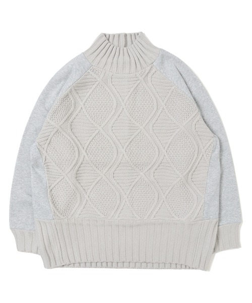 ケーブルニット×スウェットの異素材切替で存在感たっぷりのニット。 ざっくり編まれた温かみのあるケーブルニットとカジュアルなスウェットを 組み合わせたクリフらしいリメイク風デザイン! ボリュームネックで小顔効果も◎ 裾のリブを長めにし腰回りのボリュームを抑えたデザインで、スッキリ着こなせます。 他とは違う個性が出せ、コーディネートの主役になるおすすめアイテムです。 ------------------------- シルエット:スタンダード 生地の厚さ:中肉 透け感:なし 伸縮性:あり 裏地:なし ケア方法:洗濯機洗い可 ------------------------- ●『KRIFF MAYER』(クリフメイヤー) General Wear for FAMILY CAMP!! 家族で着られるアメリカンカジュアルをテーマに誕生したクリフメイヤー。 より家族が生き生きと暮らすには、シティネイチャーのボーダーをなくす必要があると感じています。 その一つのキーとなるのが、「ファミリーキャンプ」だとクリフメイヤーは思うのです。 お父さんが「今週末はキャンプに行こっか」と言えば、「釣りやってみたい!それと川遊びも!」「わたしは焚き火でマシュマロ焼く!」と子供たちが嬉しそうにしている、そんな光景が日常に溢れるようにしていきたい。 クリフメイヤーに着替えたら、それは待ちに待った週末の合図。 家族との特別な時間を当たり前に。 クリフメイヤーの「General Wear for FAMILY CAMP!!」にはそんな想いが込められています。
