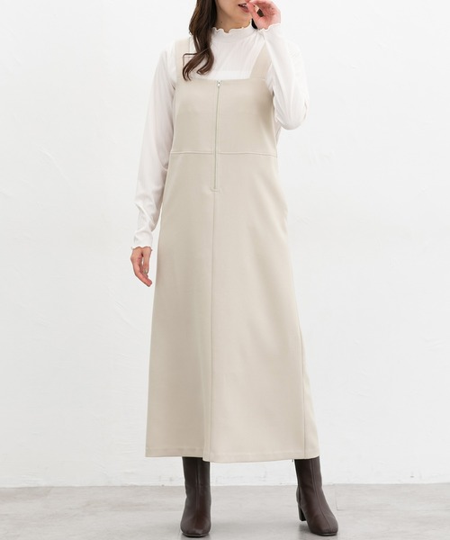 今年らしいフロントジップ使い 【デザイン】 フロントジップ使いが今年らしいデザイン。 肩ひものボタンでお好みの長さに調整可能。 ハイウエストの切り替えでスタイルアップ効果抜群! 【素材・機能】 これからの季節にぴったりなウール調ツイル素材。 便利な両サイドポケット付き。 【スタイル】 ロンTからブラウス、ニットまでさまざまなトップスと好相性◎ 合わせるインナー次第でロングシーズン活躍! ※身丈は前身頃のサイズ(肩ひも調節可・長さ:[S]47[M]48.5[L]50[LL]51.5) ※前中心ファスナー開き ※裾後中心ベンツあり 品番:557-53-9293