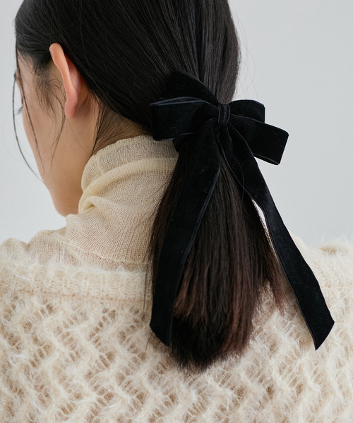 シニヨンヘアなどにオススメ!トレンドリボンアイテム。◆2024-25秋冬◆ 【デザイン・シルエット】 ひらりと垂れるシルエットが女性らしいリボンヘアカフ。 <POINT> ・結び目に挿すだけで簡単に決まるカフ仕様。 ・ダブルの輪っかで立体感を出し、シンプルな中にもさりげない華やかさを演出。 ・ベロア素材で上品さも感じられる仕上がり。 【カラー】 ブラックの1色展開。 【おすすめのスタイリング】 長く垂れる仕様なので、ミニワンピやミニ丈ボトムとの相性抜群です◎