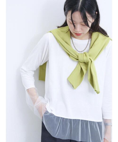 袖口と裾をエアリーなチュールで切り替えたロングスリーブTシャツ。 旬のシアー素材をドッキングして、スタイリングもこなれ感のある着こなしにみせてくれます。 シンプルながらも華やかさがあり、コーデもブラッシュアップしてくれるアイテムです。 ※商品画像は、撮影環境やお客様のご利用のPC・スマートフォンのモニター環境などにより実物と色味に差異がある場合がございます。