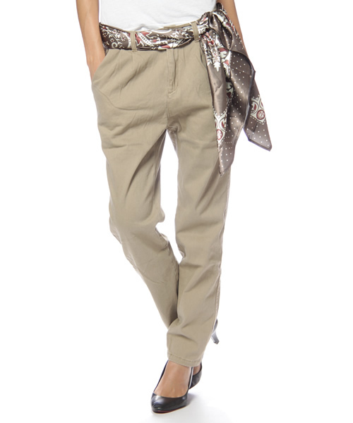 スカーフ付きのチノパンツ。人気のスカーフ付きアイテムです。ゆったりとした腰周りの2タックデザイン。何本あっても使えるチノパンツは今期のマストアイテムです。18103F30140model:H169 B77 W63 H87 着用サイズ:SMALL