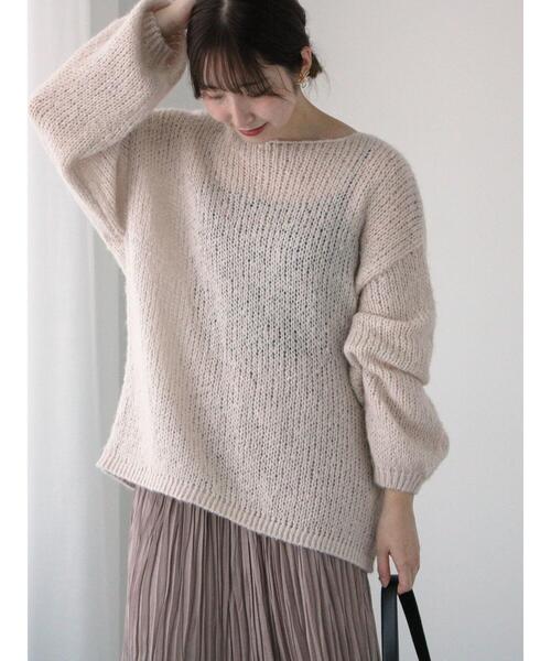 モヘヤライクなふんわり感が可愛らしいニット。 旬のシアーな質感と繊細なラメで、スタイリングもこなれ感のある印象に◎ ゆるシルエットでリラックス感があり、締め付けのない着心地の良さも魅力ポイント。 優しいカラーで品よくスタイリングでき、女性らしい着こなしが楽しめる1着です。 ※商品画像は、撮影環境やお客様のご利用のPC・スマートフォンのモニター環境などにより実物と色味に差異がある場合がございます。