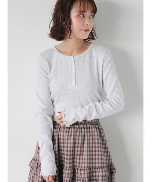 サイドのシャーリングがニュアンスをプラスするヘンリーネックカットソー。 裾と袖口のメローフリルも愛らしい表情を演出してくれます。 肌触りの良い綿100%素材を使用しており、快適に着用することができるのも嬉しいポイント。 シンプルに着るのはもちろん、レイヤードのインナーとしてなど、様々なスタイリングに活躍してくれます。