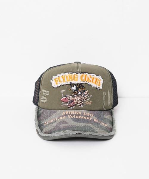 アビレックスのフライングサーカスのメッシュキャップ。 フロント部分はフライングサーカスの刺繍がインパクト大。 ハードな加工が特徴でコストパフォーマンスも高く、普段のコーディネートのアクセサリー感覚で アクセントとしてもおすすめです。