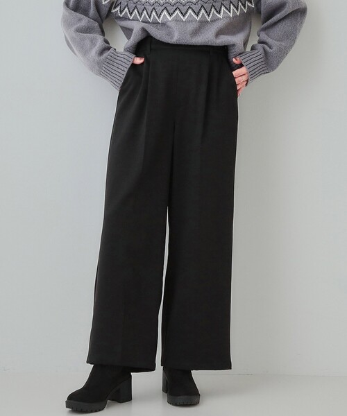 きれい見えサイドタブワイドパンツ【デザイン】大人のきれいめスタイルに1本は持っておきたい、美脚見えワイドパンツ。センタープレス入りで、スタイルアップ効果も。腰回りはすっきり華奢見えするウエストラインで、オフィスシーンにもマッチ。ウエストに施したタブデザインがワンポイントになっています。ウエストバックゴム仕様なので、着心地は楽チンなのも嬉しいポイント。※ポケット数:横×2【スタイリング】秋から冬にかけて大活躍間違いなしのワイドパンツ。ブラウスをインしてウエストデザインを見せていただくのがおすすめ。ニット合わせてリラクシーなスタイルも。どんなトップスにも合わせやすい一枚です。【お客様からいただいたコメント】・・・お客様から穿きやすいと評価をいただいています・・・・秋らしい色合いと流行に左右されない柄なので飽きがこない。 ワイドパンツな上、ウエストがゴムなので楽に穿けます。気に入ってます。 (身長:165cm 体型:普通 チャコールグレーのLサイズ購入)・生地の伸縮性が心配でしたが、お店で試着した時にボタンをつけたままでもするっと穿けたので即決しました。 ワイドパンツですがセンタープレスのおかげか、シルエットもすっきりしています。 裏起毛ではないので寒くなったら中に厚手のタイツを穿いてもよ良さそう。長く穿けそうです。 とのお声を頂戴しております。【素材】柔らかで暖かみのあるウール調素材。洗濯機洗いOK。ナチュラルストレッチで穿きやすい素材です。リサイクルポリエステルを使用した環境にやさしい商品です。※ポリエステルの一部にリサイクル糸を使用しています。※裏地なし※照明の関係により、実際よりも色味が違って見える場合があります。また、パソコン・スマートフォンなどの環境により、若干製品と画像のカラーが異なる場合もございます。モデル情報:身長163cm B81 W59 H88 着用サイズ:02(M)店舗へのお問い合わせ商品番号:741-69032●製品寸法:02(M):W67~91cm H104cm 股下67cm 前股上29cm 渡り幅36cm 裾幅29cm03(L):W70~94cm H107cm 股下68cm 前股上30cm 渡り幅37cm 裾幅30cm04(LL):W73~97cm H110cm 股下69cm 前股上30cm 渡り幅38cm 裾幅30cm備考: