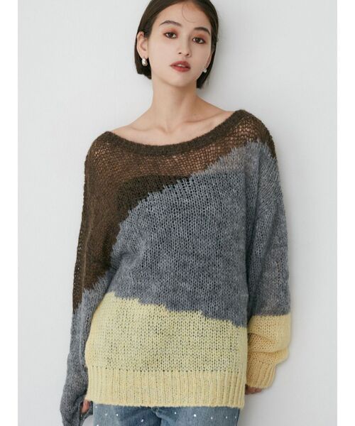 MURUAらしい絶妙な配色がポイントオフショルにして抜け感を出すのがオススメ!■アイテム配色が目を惹くシアーニット。首周りを広めに作っているので、シンプルにボートネックとしての着用に加えて、片方肩を落としたワンショルとしても◎カジュアルなデザインですが、女性らしくご着用いただけます。透け感のあるニットなので、インナーはタンクやロンTなどと合わせて着ていただくのがおすすめです。■スタイリングデニムやスラックスなどと合わせたカジュアルなスタイリングがおすすめ。腰回りが隠れる丈感なのでハーフパンツと合わせるのもトレンドスタイリングで◎■スタッフ着用のコメント・身長:159cm配色がおしゃれで着るだけでこなれ感アップ。ワンショルにも着れるので雰囲気替えも◎程よい肌見せが女性らしさをアップしてくれます。・身長:153cm丈感はヒップまわりまで隠れてくれるので、ショートパンツとの合わせでミニワンピースとして着用も◎首もと広めに開いているので鎖骨まわりスッキリ見えします!--------------------------------------------透け感:あり 生地の厚さ:薄手伸縮性:あり サイズ感:ゆったり--------------------------------------------【知って得する便利機能◎ 】■商品のお気に入り登録再入荷時、ラスト1点の時にお知らせします。■ブランドのお気に入り登録新商品やお得な情報など、いち早くお得な情報をゲット!ぜひご活用ください。※着用画像はフラッシュの加減で実際の製品と色味等が異なる場合がございますので、生地のズームアップ画像をご確認ください。※ご利用の端末画面の設定により実際の商品と色味が異なる場合がございます。