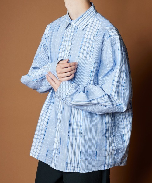 【 生地 】 ストライプやチェック生地をパッチワークしたようなデザインが特徴的なコットン生地を使用しています。【 デザイン・シルエット 】ゆったりめのシルエットにブルーのチェック&ストライプ柄が特徴です。R.(アール ドット) : シンプルでトレンドを意識したデザインが特徴的なブランド。程よくルーズなシルエットと、どんなスタイルにも合わせやすいシンプルデザインがポイントのブランドです。