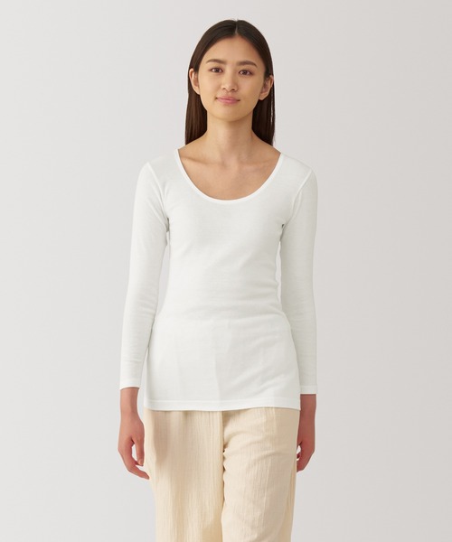 吸湿発熱性のある生地を使用した、肌当たり良い綿100%インナー。綿はオーガニックコットンです。 【素材】 脇に縫い目のない仕様で、程よくフィットします。アウターに響きにくい薄手タイプです。 【デザイン】 アウターから出ないよう、ネックが広く開いていたデザインです。八分袖でアウターから出ないようにめくる必要がありません。 【仕様】 透け感:なし(白のみややあり) 伸縮性:あり フィット感:普通 お取扱い上のご注意 : ●濃色製品は使用中の摩擦や濡れた状態での接触により色移りする事があります。洗濯の際は他のものと分けて洗ってください。 お取扱い上のご注意2 : ●素材の特性上、色ムラや風合いにばらつきがあり、商品ごとの色差や同一商品の中でも部位ごとに色差が生じている場合がありますのでご了承ください。 お取扱い上のご注意3 : ●素材の特性上、毛羽立ちにより白化が生じますのでご了承ください。 お洗濯上のご注意 : ●淡色製品には蛍光増白剤入り洗剤を使用しないでください。 お洗濯上のご注意2 : ●洗濯ネットをご使用ください。 お洗濯上のご注意3 : ●プリント部分はアイロンでこすらないでください。