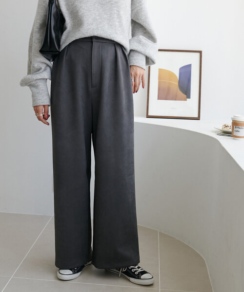●デザイン 柔らかくしっとりとしたエコスエード素材を使用したシーズンムードを高めるストレートパンツ。 2タックのデザインがあることで、腰回りにゆとりがありシルエットを拾いすぎないのもうれしいポイント。 後ろのみゴム仕様で、正面のウエストはきちんと感を出しながら着脱のしやすさも兼ね備えたパンツです。 ●スタイル Tシャツやデニムジャケットと合わせたカジュアルコーデ。 Iラインが綺麗なストレートパンツなので、ボリューム感のあるトップスとも相性抜群〇 ●素材 しっとりとした滑らかな生地感。 *********************** 洗濯方法:ドライクリーニング 裏地:なし 透け感:なし 伸縮性:ややあり 光沢感:ややあり 生地の厚さ:やや厚め *********************** 【入荷時期について】 入荷日ごとに販売数量が決まっているため、オンラインでは完売後に次期納期の数量にて予約販売を行っております。 店舗入荷時期と予約商品のお届け時期が異なる場合がございますので、予めご了承ください。 ※追加入荷のある商品もございますので、詳しい店舗入荷時期に関しましてはお近くの店舗へお問い合わせください。 ※店舗の在庫状況に関しましては、こちらのページに記載されている「店舗在庫」から確認にしていただけます。 「在庫あり」の表記でも、お取り置き分などでお客様に販売できない場合がございます。 ※予約商品でも、店舗では追加がない場合もございます。ご了承ください。 ※初回予約商品でも配送処理が発生するため、店舗より遅れてのお届けとなる場合がございます。