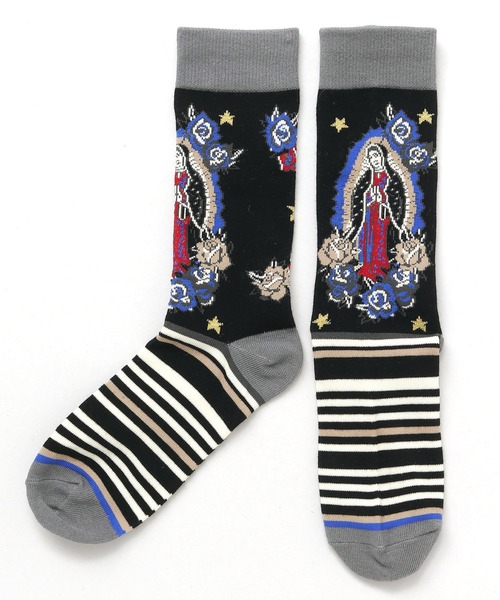 FEEL GOOD SOCKSメキシコの守護聖人、聖母グアダルーペ(マリア様)がモチーフの靴下。さりげないラメ糸の星柄がアクセントに★メキシコでは12月12日は聖母グアダルーペの日。文化的な祝祭としてパレードや行進が行われ、音楽や歌、踊りで祝福され明るく楽しく賑わいます。※こちらの商品は1点1点職人による手作りとなります。その為、形や色合いなど若干異なる場合がございます。あらかじめご了承ください。Amina Collection Co.,LTD.