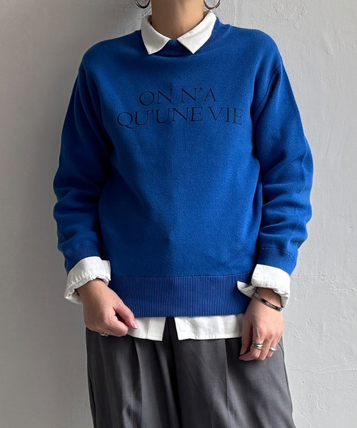 スウェット風に見えるロゴ入りニットプルオーバー。 カーゴパンツやデニムに合わせたり、Iラインスカートやフレアスカートなどレディなボトムとも相性良くコーディネートできます。 【素材】 スウェットのような軽さあるニット。 【デザイン】 リブ使いのゆったりプルオーバー。 【ポイント】 起毛するニットでは暑い季節でも着られるよう軽く仕上げたニット。 ロゴはレター調の大人っぽいロゴにして、カジュアルすぎないようにしています。 [クリーニング] 手洗い可、ウェットクリーニング(W)、洗濯の際はネットを使用してください