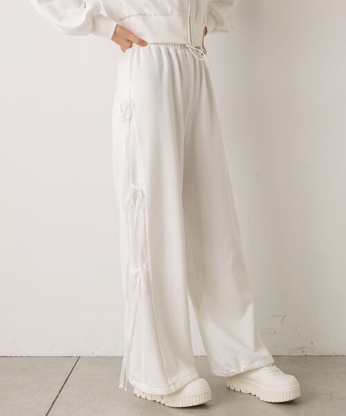韓国スタイルを叶えるスウェットパンツ ■デザイン ・サイドのレースリボンがかわいいトレンドライクなスウェットパンツ。 ・スポーティーなアイテムながらリボンが付いているので、カジュアルになりすぎないデザインです。 ・体系を拾わずストンと落ちるワイドシルエットで、華奢見えを叶えます。 ・裾がドロストで絞れるようになっているので、好みのシルエットに変えて着用していただけます。 ・柔らかくさらっとした触り心地で、ストレスフリーな着心地。 ■カラ― ・オフ/ピンク/サックス/トップグレーの4色展開 ■スタイリング ・フードファーパーカー(品番:1042060300)と合わせてセットアップで着るのがおすすめ。 ・コンパクトなトップスやクロップド丈のトップスと合わせると、メリハリのある韓国風な着こなしに◎ ・足元は厚底スニーカーやムートンブーツとの組み合わせがかわいいです。 ------------------------------- 裏地:なし 光沢感:なし 透け感:なし 伸縮性:ややあり 手洗い:可能 タンブラー乾燥:不可 アイロン:150℃まで ------------------------------- model:161cm/166cm ※着用、お取り扱いの際は、商品についている品質表示とアテンションタグを必ずご確認下さい。 ※ご覧のモニター環境や撮影環境により実際の商品と多少色味が異なって見える場合がございます。 ご理解の程よろしくお願いいたします。 お取り扱い上の注意 ※キャンペーンやフェアにより価格が変動する場合がございます。 ※サンプルで撮影している為、実際の商品と若干仕様が異なる場合がございます。 ≪返品・交換について≫ ・着用後、洗濯後の返品・交換は致しかねます。 ・商品到着後、着用前に商品状態のご確認をお願い致します。