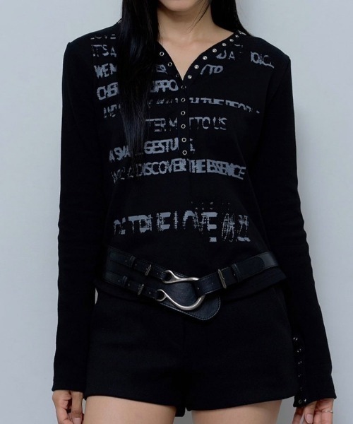 韓国ブランド NASTY FANCY CLUB ナスティーファンシークラブ VINTAGE LETTERING SNAP LONG SLEEVE ビンテージレタリングスナップロングスリーブ ブイネックTシャツ 長袖Tシャツ ロゴTシャツ プリントTシャツ 韓国ファッション 韓国ストリート ストリートファッション