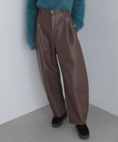 〔fabric&design〕 人気のカーヴィーパンツを秋冬らしい合皮素材に落とし込みました。 柔らかさはありますが、カーヴィーラインがヘタレたり、へこんだりしないよう、コシのある合皮にし、脇は折り伏せにしてステッチデザインを入れています。 フロントボタンは同色染めのドットボタンでシンプルに仕上げています。 フロントのタックを入れることで、横から見た時のフォルムが立体的になる他、腰まわりにボリュームを持たせ、ウエストが細く見えるように魅せています。 〔styling〕 冬はニット全般と相性がよく、春秋はシャツやカットソー合わせと3シーズン楽しんでいただけます。 ■透け感:なし ■生地の厚さ:厚手 ■裏地:なし ■伸縮性:ややあり ■光沢:ややあり ■シルエット:スタンダード --------------------------------------------------- ◆商品のお気に入り登録◆ お気に入りアイテムの値下げ・再入荷・在庫1点などの通知を受け取ることができます。 ◆ブランドのお気に入り登録◆ 新商品や再入荷、セール、クーポン配布などお得な情報を受け取ることができます。 ---------------------------------------------------