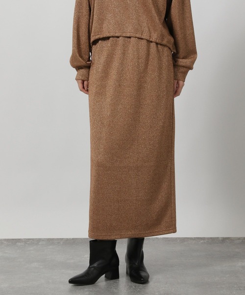 すっきりとしたナローシルエットのスカート。細身のシルエットでも後ろにスリットがデザインされ、窮屈さなく着用いただける1枚です。ウエストにはゴムを使用しているので着脱しやすさもポイント。【素材】ラメ混糸で華やかさもあり、伸縮性のある柔らかな素材感。ーーー【スタイリング】シンプルなアイテムとの相性〇同素材のトップスとのセットアップスタイルもおすすめです。▼同素材のトップスはコチラブランド品番:232356ZOZO商品コード:88294041