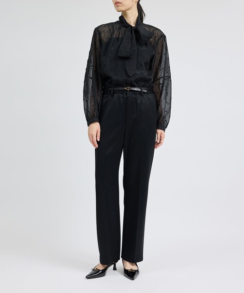 【素材】 ウールサテン素材で、上品な光沢感とストレッチ性があり着用しやすい素材感。毛羽も感じないので、ストレスなく着用可能です。 【デザイン・シルエット】 ウエストぐるりゴム仕様のイージーなテーパードパンツ。イージーな履き心地ながら、センタープレス入りですっきり見えるシルエットが特徴。 【カラー】 ピンク、ベージュ、ブラックの3色展開 【おすすめのスタイリング】 オン、オフどちらでも着用可能な万能アイテムで、ツヤがあるのでニットとの相性もよく、アウターインにもおすすめです。 ---------------------------- 透け感:なし 裏地:なし 伸縮性:ややあり 光沢感:ややあり 生地の厚さ:中肉 ポケット:あり 開き方:ファスナー ---------------------------- 【モデル情報】 モデル身長:169cm 着用サイズ:38(ロングヘア) モデル身長:170cm 着用サイズ:38(ショートヘア) ※画像の商品はサンプルです。実際の商品と仕様、加工、サイズが異なる場合がございます。 ※撮影場所やライティング、お使いのモニター環境によって色の見え方が異なる場合がございます。 ※商品のカラーは画像の色味をご参照ください。動画は仕様説明のため、色味が実物と異なる場合がございます。