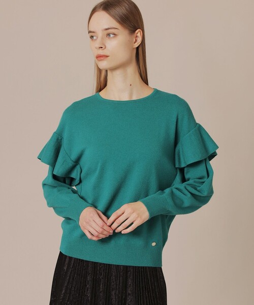 【着用推奨シーズン:秋・冬】 <素材説明> 細番手の羊毛にカシミヤをブレンドし、肌触り良くシルエットがきれいな素材です。 <デザインポイント> 肩にラッフルを施したニットプルオーバーです。肩部分のラッフルは少なめにし、肩は華奢にデザインは印象的に仕立てています。エレガントなスタイリングに汎用性高く活用いただけます。同素材のベスト(品番:G5N27418)もご用意しております。