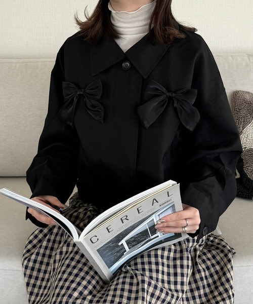 大きいリボンが可愛く、存在感たっぷりのブルゾン幅広いアイテムとも合わせやすい絶妙なシルエット。Eツイルの素材感が魅力で今の季節にピッタリ。合わせやすいブラックカラーで、これを羽織るだけで主役級の印象を与える今季の一押しアイテムです。𝗆𝗈𝖽𝖾𝗅𝟣𝟧𝟥𝖼𝗆 Fサイズ着用■カラー:ブラック■サイズ:【F】着丈:約52cm 肩幅:約60cm バスト:約130cm 袖丈:約51cm 袖口:約25cm 裾周り:約86cm(ゴム:約130cm)▼商品のお気に入り登録お気に入りアイテムの値下げ・再入荷・在庫1点などの通知を受け取ることができます。 ▼ブランドのお気に入り登録新商品や再入荷、セール、クーポン配布などお得な情報を受け取ることができます。※ご注文いただいた予約商品のお届け時期の確認は、注文履歴ページより行えます。merrylatte メリーラテは韓国ファッションを中心にトレンドアイテムをおとどけしています。※ご注意※※撮影の天候状況により、実際の商品の色味に若干の違いが発生する場合がございます。※ご注文いただいた予約商品のお届け時期の確認は、注文履歴ページより行えます。※他のキャンペーンにより、期間中に価格が変動する場合があります。