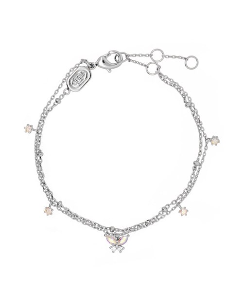 Butterfly double chain charm bracelet with aurora borealis cubic zirconia. Available in gold, 925 silver and rose gold. Jewellery perfect for everyday wear. Safe for sensitive skin. Worldwide shipping available.