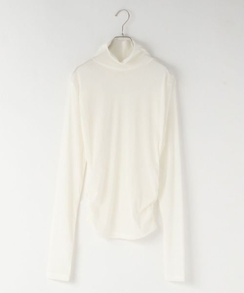 ■デザイン■柔らかいチュールにフロッキープリントを施しベロアのような風合いに仕上げたハイネックトップス。程よくゆとりを持たせることで、1枚でもインナーとしても使いやすくなっています。衿元はあえて緩めにし、少し生地がたまるようにこだわりました。■スタイリング■1枚でシンプルに着こなしたり、キャミワンピやサロペットのインナーとしてもオススメです。寒い時期はニットやウラケなどのインナーとして活躍します。