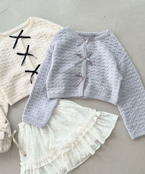 思わず触りたくなる、やわらかカラーのフロントリボンカーディガン ■デザイン ふわふわやわらかな糸を使用した、フロントリボンがポイントのニットカーディガン。 立体的な編地が華やかな印象をプラスしてくれます。 リボンは縫い付けているので、前を開けてもリボンディティールを楽しめるのも嬉しいポイント。 前を閉めてプルオーバーのように着ることもできるので、様々な着こなしが楽しめます。 優しい雰囲気のカラー展開も魅力です。 ■サイズ感 身頃はゆったりとしたサイズ感。中にも着込みやすくなっています。 丈は短めなので、着ぶくれせず着ていただけます。 低身長さんや小柄な方もスタイリングのバランスがとりやすい丈です。 #低身長 #小柄 ※ネックポイントからの着丈:44cm ■スタイリング カーディガンとしてはもちろん、トップスとしても着られる万能ニット。 ワンピースやスカートできれいめに、デニムやミニボトムでガーリーに、 様々な着こなしが楽しめます。インナーに柄物を入れても◎ ・・・・・・・・・・・・・・・・・・・・・・ 透け感:なし 裏地:なし 伸縮性:あり 光沢感:なし 生地の厚さ:普通 ・・・・・・・・・・・・・・・・・・・・・・ ■商品のお気に入り登録 再入荷通知やのこりわずか、お得なプライスダウンの情報も受け取ることができます。 ぜひご登録ください◎ ※サンプルでの撮影の為、製品と仕様が異なる場合がございます。
