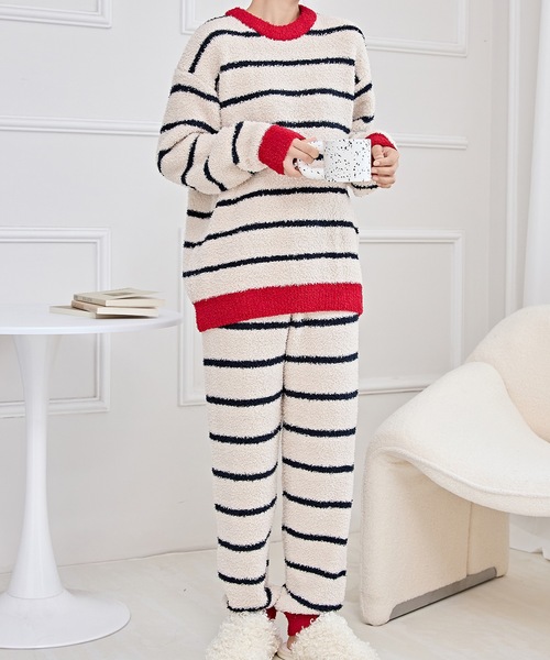 ふわもこのやわらかな素材感が、見た目にもウォーミーなルームウエア。 寒さが本格化する秋冬シーズンにも、あたたかく過ごすことのできるセットです。 毛足長めのニット生地が触れる素肌にも心地良く、ゆったりとしたシルエットで窮屈さを手放したストレスフリーな着用感。 身につけるだけで気分も上がりそうな、ポップな配色とデザインも魅力です。 お風呂上がりのリラックスタイムや、休日の部屋着に。 冬の寒さをオシャレに楽しむ、ウィンターシーズンのマストアイテムです。 <注意点> ・色合いはモニター環境により若干の誤差が出ます。 ・サイズは測り方により若干の誤差が出る場合がございますが、予めご了承ください。 ・入荷・生産時期により、色、サイズ、素材など多少異なる場合がございます。 ・本製品は生産過程におきまして、生地を織る際の糸の継ぎ目や多少のほつれが生じることがあります。 ・簡易包装となっており、保管・梱包時にシワが伴う場合がございます。