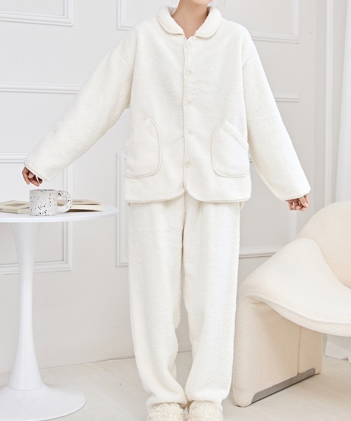 ボリュームたっぷりのふわもこデザインが可愛らしい、長袖ルームウエア。 まるで毛布に包まれているかのような心地良さとウォーミーなルックスは、寒さが本格化する秋冬シーズンにもぴったりのアイテムです。 定番の前開き仕様なので子どもっぽくなりすぎず、着脱のしやすさもうれしいところ。 トップスはフロントオープンにすることで、羽織りとしてもお使いいただけます。 パイピング風の縁取りでボリューミーなシルエットに引き締め感を出した、大人っぽさを感じるディテールも魅力です。 くすみ感のあるトレンドライクなカラーラインナップでご用意しました。 <注意点> ・色合いはモニター環境により若干の誤差が出ます。 ・サイズは測り方により若干の誤差が出る場合がございますが、予めご了承ください。 ・入荷・生産時期により、色、サイズ、素材など多少異なる場合がございます。 ・本製品は生産過程におきまして、生地を織る際の糸の継ぎ目や多少のほつれが生じることがあります。 ・簡易包装となっており、保管・梱包時にシワが伴う場合がございます。