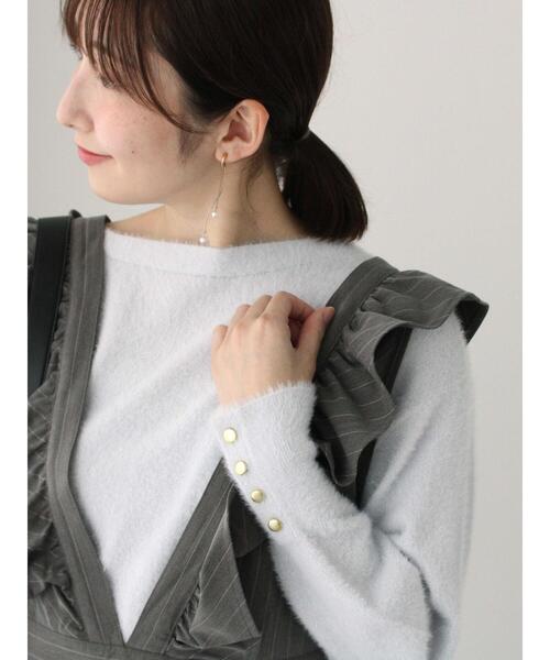 きらきらとしたラメフェザーが華やかなムードを演出するニット。首元はボートネックになっており、すっきりとした印象を与えます。袖口にあしらわれたボタンがコーディネートのアクセントに◎パンツスタイルはもちろん、スカートと合わせたスタイリングもおすすめです。※商品画像は、撮影環境やお客様のご利用のPC・スマートフォンのモニター環境などにより実物と色味に差異がある場合がございます。