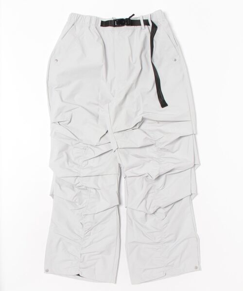 DankeSchon 大胆なパッカリングデザインが主役のナイロンパンツ。 パリッとしたナイロン素材をベースに、膝下にしわ寄せ(パッカリング)をほどこした程よいボリューム感がトレンドライクな仕上がりの一本です。 ベルト付きのゆったりとしたオーバーサイズでユニセックスに着用いただけます。 トップスにはカットソーやクルーネックスウェット、パーカーなどのストリートアイテムからシャツやニットなどのカジュアルアイテムとも好相性です。 DankeSchon・・・DankeSchonとは、このブランドの核となるキーワード D digitaliyデジタル式 A Architect創造者 N neologism新表現 K kittenish悪ふざけ E engrossing心を奪う の頭文字を組み合わせたものにドイツ語のSchonを付け、ブランドの意図に賛同してくれる人達に感謝の意味を込め、「DankeSchon(ありがとうの意味)」としている。 ファッションのテーマは「ニュースタンダード」。 時代に抗うのではなく、すり抜け受け流すことでブランドに見合う要素を抽出し、高品質な素材と、デジタライズなグラフィックを掛け合わせコレクションに落としていく。 純粋なシルエット、ディテールへの徹底したこだわりと同時に、ユニークで新しい見解も積極的に取り入れる。 そこから生み出された製品は、実用的でごく自然に日常に馴染むもの。