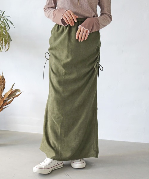 サイドのギャザーデザインがポイントのスカート。立体感のあるギャザーデザインが大人っぽく女性らしさを演出します。リボンでギャザーを寄せることで着丈の調節が可能なので、お好みの丈感で着られるのも魅力的。ややタイトめなストレートシルエットで、ルーズニットに合わせやすい形になるようこだわりました。シンプルなトップスとも1枚でサマになる万能アイテム。コーディネートに馴染みやすく、秋冬に大活躍のカラー展開です。ウエストは一周ゴム仕様でストレスフリーな穿き心地です。抜け感のあるバックスリット入りで見た目以上に動きやすい作りになっています。シーズンムード漂う温かみのある素材感。裏地付きなので透け感を気にせず安心して穿いていただけます。- - - - - - - - - - - - - - - - - - - - - - - - - - - - - - - - -透け感:なし裏地:あり伸縮性:なし光沢感:なし- - - - - - - - - - - - - - - - - - - - - - - - - - - - - - - - -※ 撮影時の照明などの環境と、モニターに表示される色味がメーカーにより変わってしまう等の理由により、実際にお届けする商品と、ご覧になられているアイテムの色が若干異なる場合がございます。ご了承下さいませ。秋服/冬服/アースカラー/ロングスカート