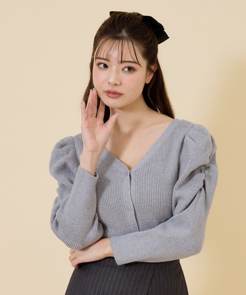 ボリュームショルダーでおしゃれ見え!デザインカーディガントップス モードな雰囲気のボリュームショルダカーディガントップス。 デコルテのあきを大きめにして、フェミニンさをプラスしました。 ショート丈でスタイルアップも叶います。 伸縮性に優れ、ハリがありつつもっちりとした肌触りで着心地が良いです。 【styling】 インナーを着て、ボタンを閉めてニットトップスとして着るのがおすすめ。 キャミソール、シアートップスなど、インナーを変えて雰囲気チェンジ! -------------------------- 透け感:なし 裏地:なし 伸縮性:あり 生地の厚さ:ふつう --------------------------- F:着丈38cm 身幅38cm 肩幅29.5cm 袖丈53cm