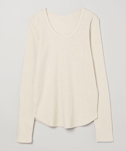 ーーー 1枚でトレンドのスタイリングに★ 動くたびにキラキラ光るラメがポイントのリブロンT ーーー ■Design さりげないラメが幅広いアイテムと合わせて、着回しやすいアイテムです。 リブが縦のラインを強調するので、スッキリとした印象に♪ トップスのレイヤードにも使いやすい、身体のラインを拾いすぎない程よいフィット感が◎ ■Material 肌触りがよく、サラッと着やすい素材です。 透けにくい生地なので、1枚でも安心して着用できるところも嬉しいポイント♪ ■Styling ワイドシルエットのボトムと合わせると◎ シャツやジャケット、カーディガンのインナーとして様々なスタイリングが楽しめます。