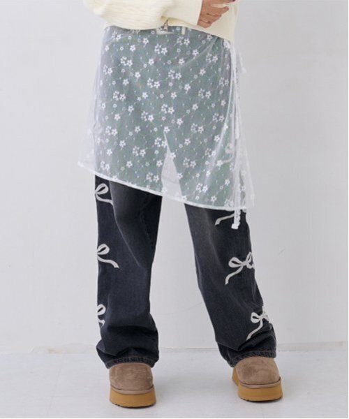 繊細な花柄のレースが上品な雰囲気のスカートです。ウエストのリボンをくるっと巻きつけて結ぶだけで、簡単に着用できます。デニムスカートと組み合わせれば、カジュアルながら女の子らしいスタイルが完成。トレンド感のあるコーディネートを楽しめる、着回しに便利なアイテムです。【透け感】透ける【生地の厚さ】薄い【伸縮性】なし【裏地】なし【ポケット】なし【アジャスター】なし