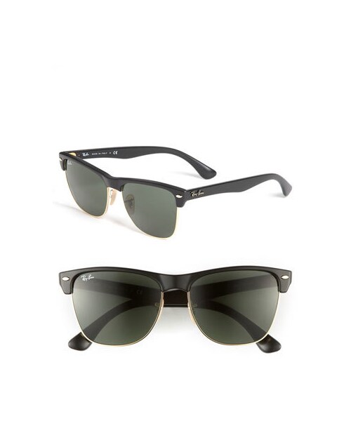 Small insets detail the temples of classic, bold-framed sunglasses with half-wire rims. 57mm lens width; 15mm bridge width; 145mm temple length. 100% UV protection. Plastic/metal. By Ray-Ban; imported.