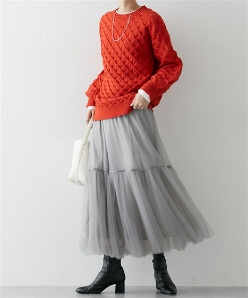 丈もしっかり長め ボリュームチュールギャザースカート ■デザイン ・チュールのボリューム感をしっかり出したおすすめのスカート♪ ・ウエストは総ゴム仕様でストレスフリーな着心地も◎ ・切替位置も着用時のバランスがキレイに見えるように調整しております♪ ■素材 裏地はボドレー使用、表はチュールを重ねています ■おすすめのスタイリング ボリュームのあるスカートなので、トップスはニットの着合わせがおススメ♪ ウエストは総ゴムなので、トップスインよりアウトが◎ 足元はスニーカーでもブーツでも相性抜群です! 【Be praised】ーーー明日ちょっと褒められる服ーーー 大人トレンドを意識したこだわりのアイテムと着こなしでアナタの毎日に輝きを。 ただシンプルできれいなだけじゃ物足りない。 カジュアルすぎず、スタイリッシュで大人の品性を感じる着こなしに。 そんな、こなれたオシャレを楽しむ女性に寄り添う、 新鮮なリアルクローズをご提案します。 <仕様> [表布]ナイロン100% [裏布]ポリエステル100% ※照明の関係により、実際よりも色味が違って見える場合があります。 またパソコン・スマートフォンなどの環境により、若干製品と画像のカラーが異なる場合もございます。あらかじめご了承のうえ、ご注文ください。 透け感:チュールはあり 伸縮性:なし 生地の厚み:普通 裏地:あり ポケット:無し ウエスト:総ゴム 季節:春・夏・秋 シルエット:ゆったり <洗濯方法> 手洗い ■キーワード 通勤カジュアル、オフィスカジュアル、大人カジュアル、大人、きれいめカジュアル、きれかじ、キレカジ、20代、30代、40代、チュールスカート、ボリュームチュールスカート、ギャザー入り、秋冬スカート、チュール、ボリューム感たっぷり、カジュアル、きれいめ