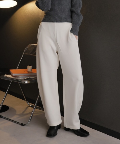 リラクシ―で可愛い◎旬なカーブパンツが登場 ■デザイン ・ウエストゴムで楽に履けて適度なゆとりがあり、ストレスのない着用感。 ・ボディラインを拾わず、さり気なくカーブしたシルエットで こなれ感のある綺麗なラインに仕上げます。 ・滑らかで程よい厚みの素材が気持ちの良く、ロングシーズンで着回しが出来ます◎ ・後ろゴムデザインなので前だけインしても綺麗なウエストデザイン。 ■素材 もちもちとした軽い素材で さらっと肌触りの良いダンボールニットです◎ ■スタイリング スウェットやロゴニットと合わせて足元はスニーカーでカジュアルに◎ ベルト付きコートやダウンジャケットなど ボリューム感のあるアウターとも好相性です♪ リラックス感のあるコーディネートで休日スタイルや ママさんにもおすすめです◎ ------------------------------ 透け感:ホワイトややあり 伸縮性:あり 裏地:なし ------------------------------ ------------------------------ 【スタッフが着用しました!】 身長:160cm 普段着用サイズ:M~Lサイズ 今回着用サイズ:FREEサイズ ・着用感 楽に履けてシルエットの綺麗なパンツです。 締め付け感のない快適な着心地で、日常使いにもぴったり♪ 長めのレングスで、スニーカーにも合わせやすい1着です。 ------------------------------------------------